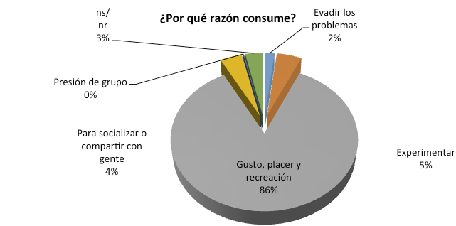 Esta es una de las respuestas que más sorpresa nos causa, pues frente a los tradicionales análisis especializados que culpan a problemas familiares, presión de grupo, inmadurez adolescente, pobreza, crisis afectivas, entre otros factores que motivan el consumo de sustancias psicoactivas, lo que encontramos fue que quienes respondieron la encuesta dicen que la razón por la que consumen es principalmente el placer.