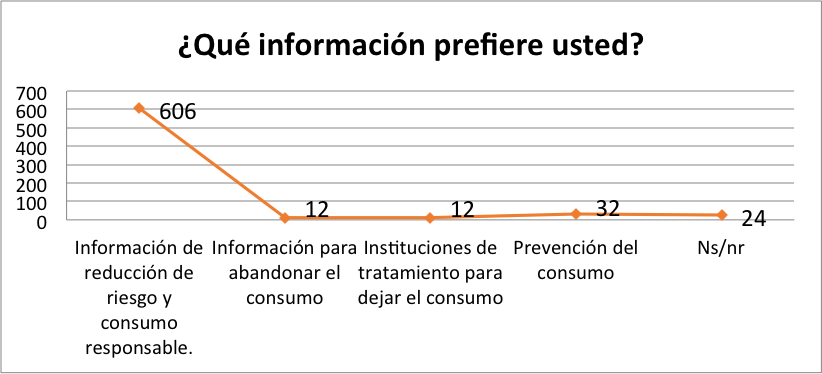 En una población usuaria poco o ningún efecto hace la información relacionada con abandonar el consumo, tener un tratamiento para dejarlo o la prevención para evitar el contacto con las sustancias; busca en más de un 80% información relacionada con reducción de riesgo y consumo responsable que le permita obtener patrones de conducta o hábitos para autorregularse.